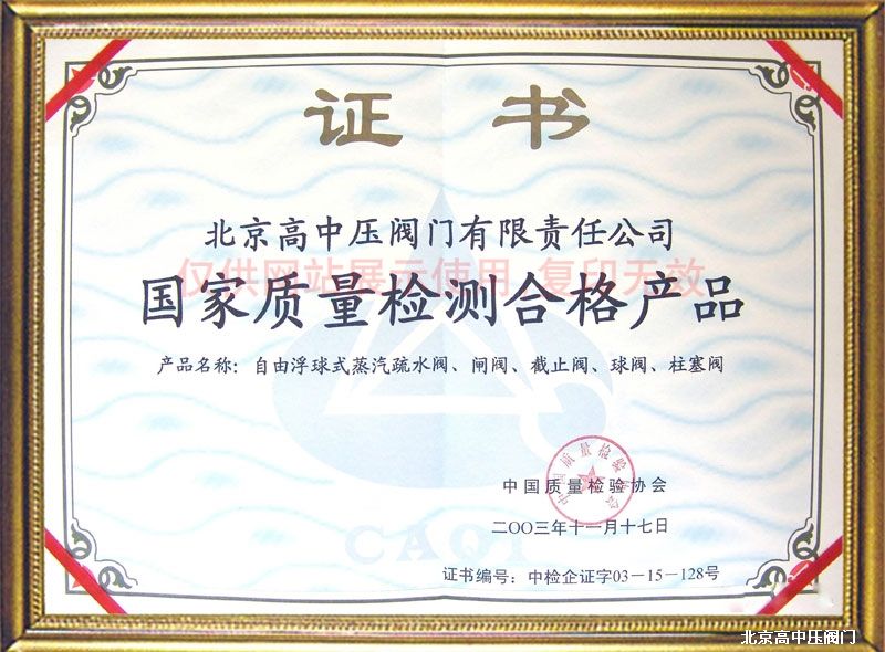 Our attention and play a number of the older generation of outstanding trap experts and professionals rely on high technology, high starting point, to be creative and technological characteristics of different industries, design and manufacture of performance products, such as the development of the free float type steam trap its unique design, sophisticated manufacturing, superior performance, in 1995, won the seventh China New Technology, New Product Exposition and China Quality Inspection Association awarded the "National Quality Inspection Qualified Product", to promote Chinese products evaluation Center was awarded the "National Consumer Trustworthy Product" and China Quality Network awarded the "National Quality Model Enterprise." Truly innovative solution to the dryer air blocked in the presence of steam vapor lock problems and to gain a number of national patent (Patent No.: ZL92233886.8 ZL95221559.4 ZL95221628.0, ZL200320127632.1), many times by the quality department awards. Company with its advanced product quality and first-class business management developed its own variety of valve products, its product technology certified by the state authorities, reached the national standard. Some products are exported to the United States, Japan, Bangladesh, Pakistan, Thailand and other countries,